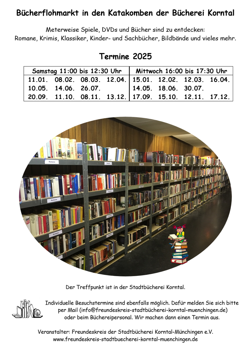 NEU: individuelle Besuchstermine sind auch möglich. Bitte melden Sie sich per Mail (info@freundeskreis-stadtbücherei-korntal-muenchingen.de) oder beim Büchereipersonal. Wir machen dann einen Termin aus.